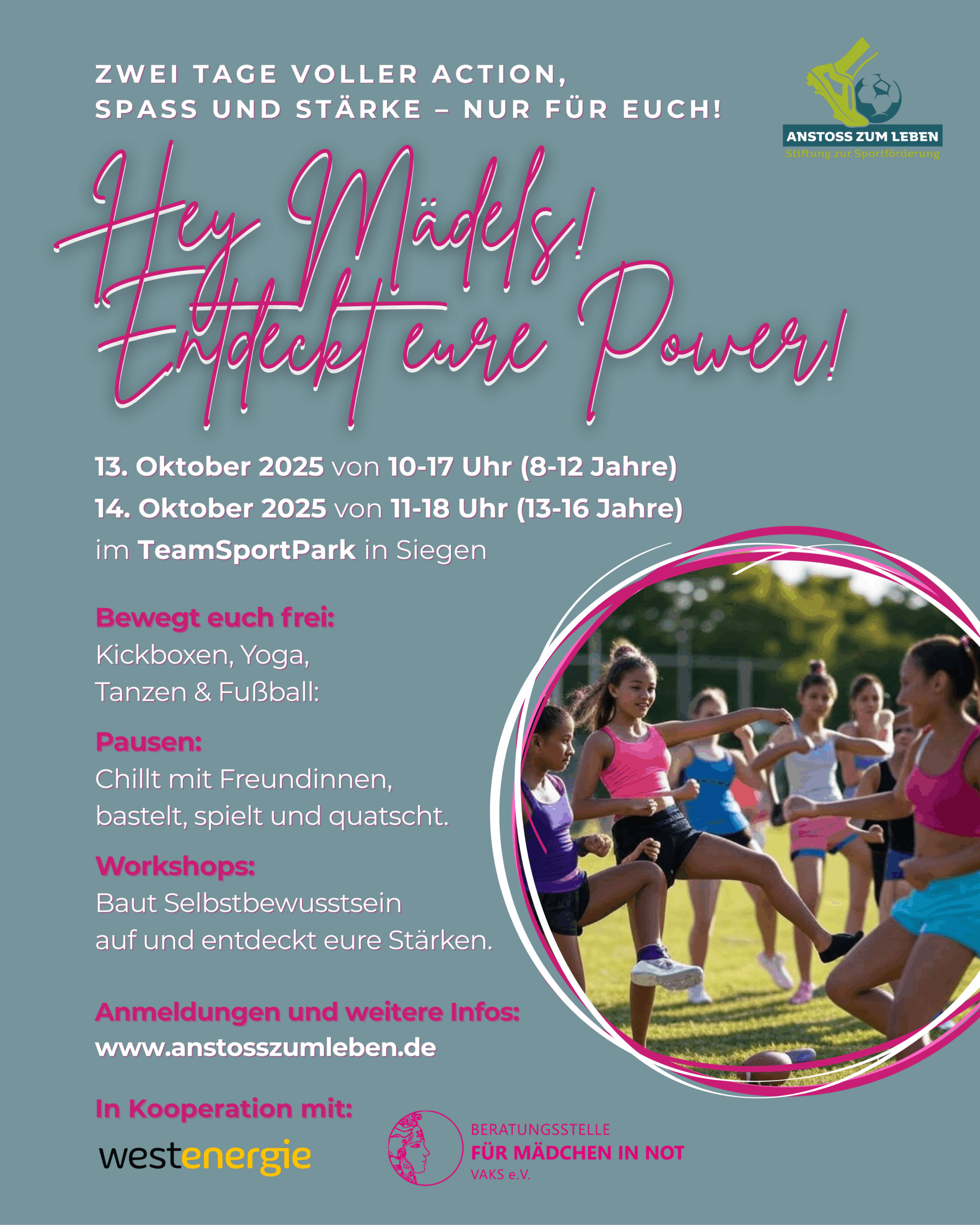 Ein Projekt von Anstoß zum Leben in Kooperation mit Mädchen in Not und gesponsert von Westenergie. Werde stark, mutig und selbstbestimmt – du schaffst das!